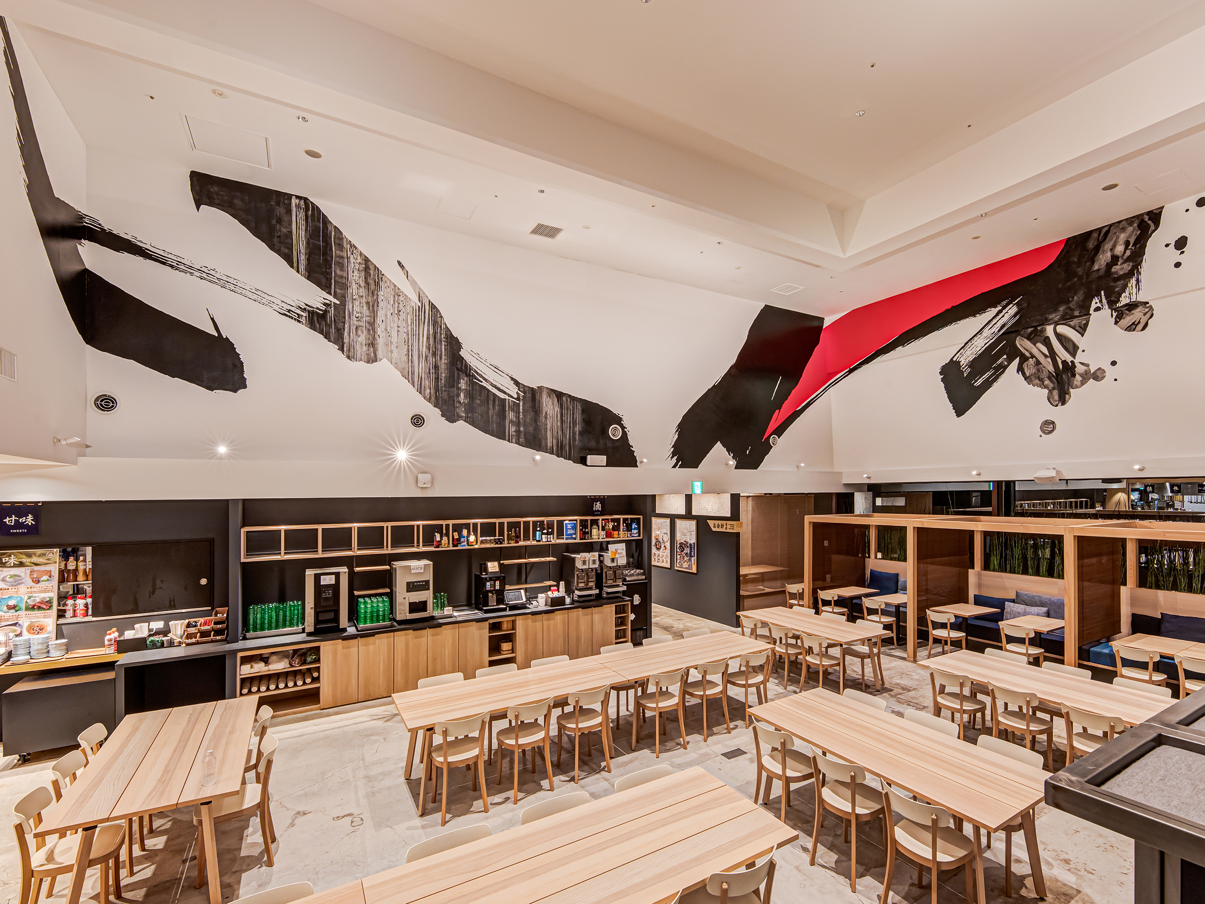 Japanese-style staff canteen in the Meguro office of a grobal e-commerce site and its Japanese branch. The large space is gently partitioned into three different 'ma' (spaces) to give the cafeteria a lively and cosy atmosphere, allowing the staff to use the space in different ways depending on their style of use and the time they spend there. While utilising the existing structure as much as possible, the space has been designed with elements of movement, such as a kitchen area where people can stand and drink, a large table area where Meguro's speciality, saury, migrates along the walls, and a high-ceilinged area with graffiti art by artist Jun Inoue. In line with the company culture, the cafeteria is used as a company canteen that adds a touch of humour to Japaneseness and a sense of chic and wit.