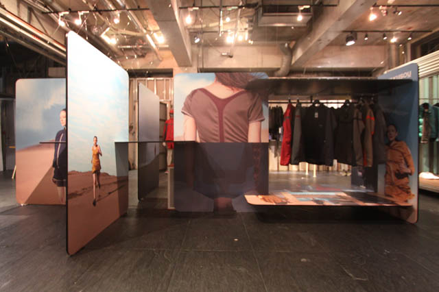 「陰と陽」がテーマのGYAKUSOU SS12コレクション。カードボードの表裏によって、テーマやMens / Womensの対比が表現されている。テーブルやハンガーは、15mm厚のカードの組合せによって構成されている。